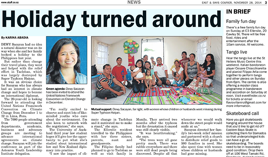 Last week our COP 20 delegate Dewy was featured in the East and Bays Courier - read their article below to find out about her experiences in Tacloban, and why she's so passionate about climate change issues.