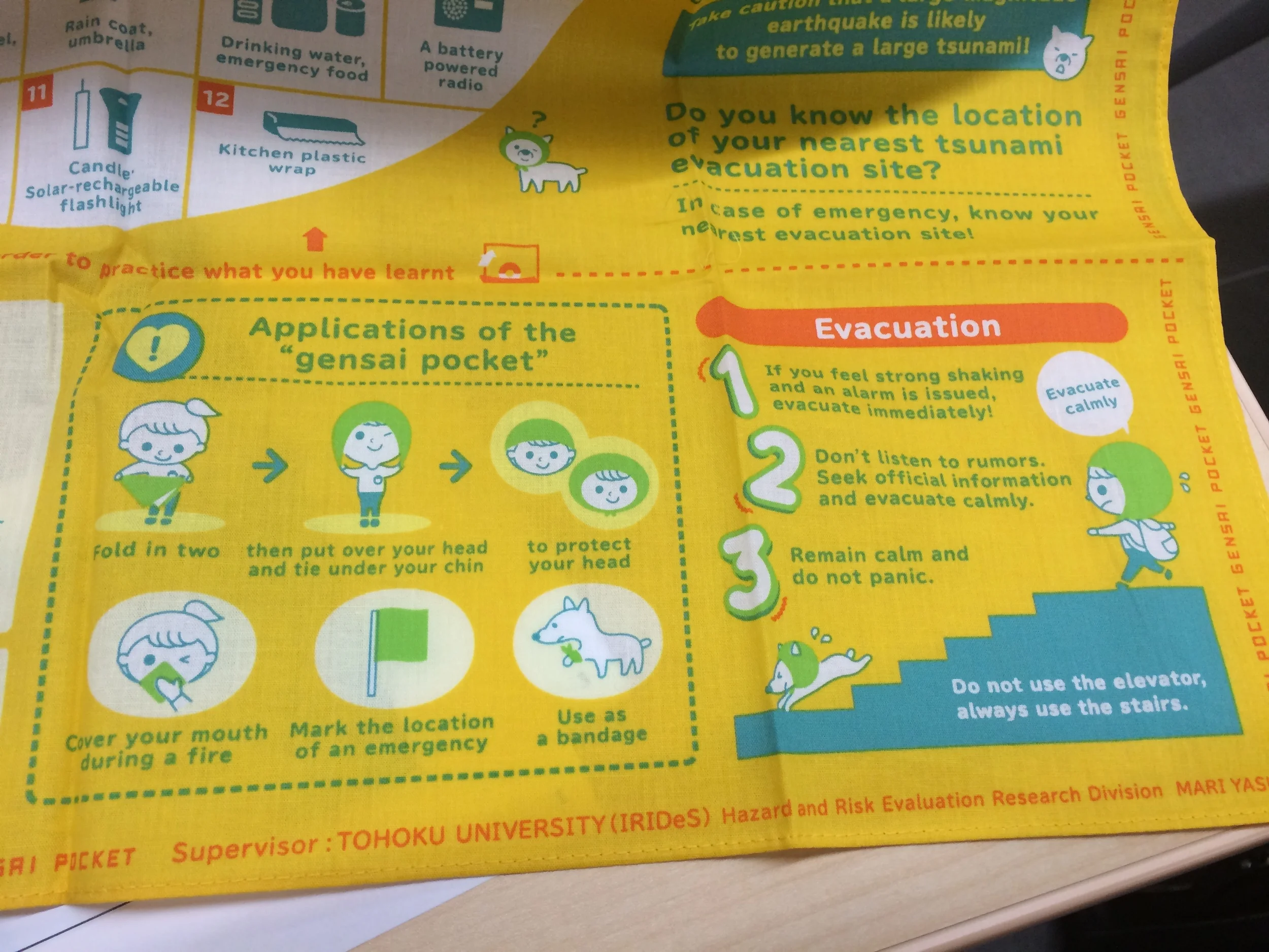 One way, Mari Yusada teaches children is through the Gensai Pocket. This multipurpose handkerchief does not only educate people what to do and prepare in anticipation, it can also be used as a head protector and many more (see photo below).